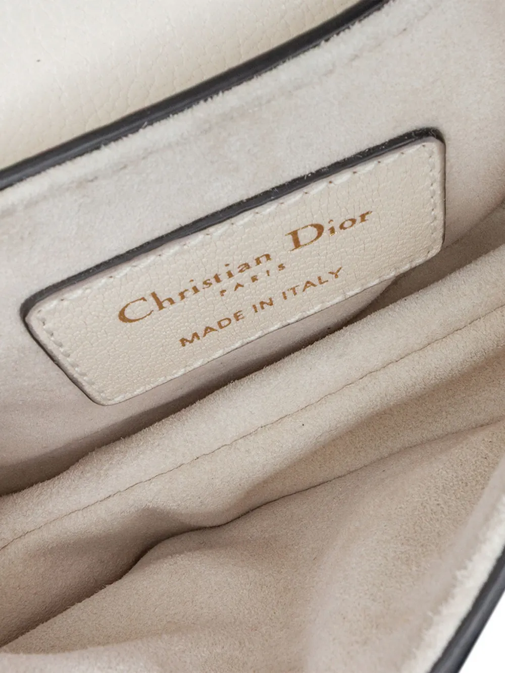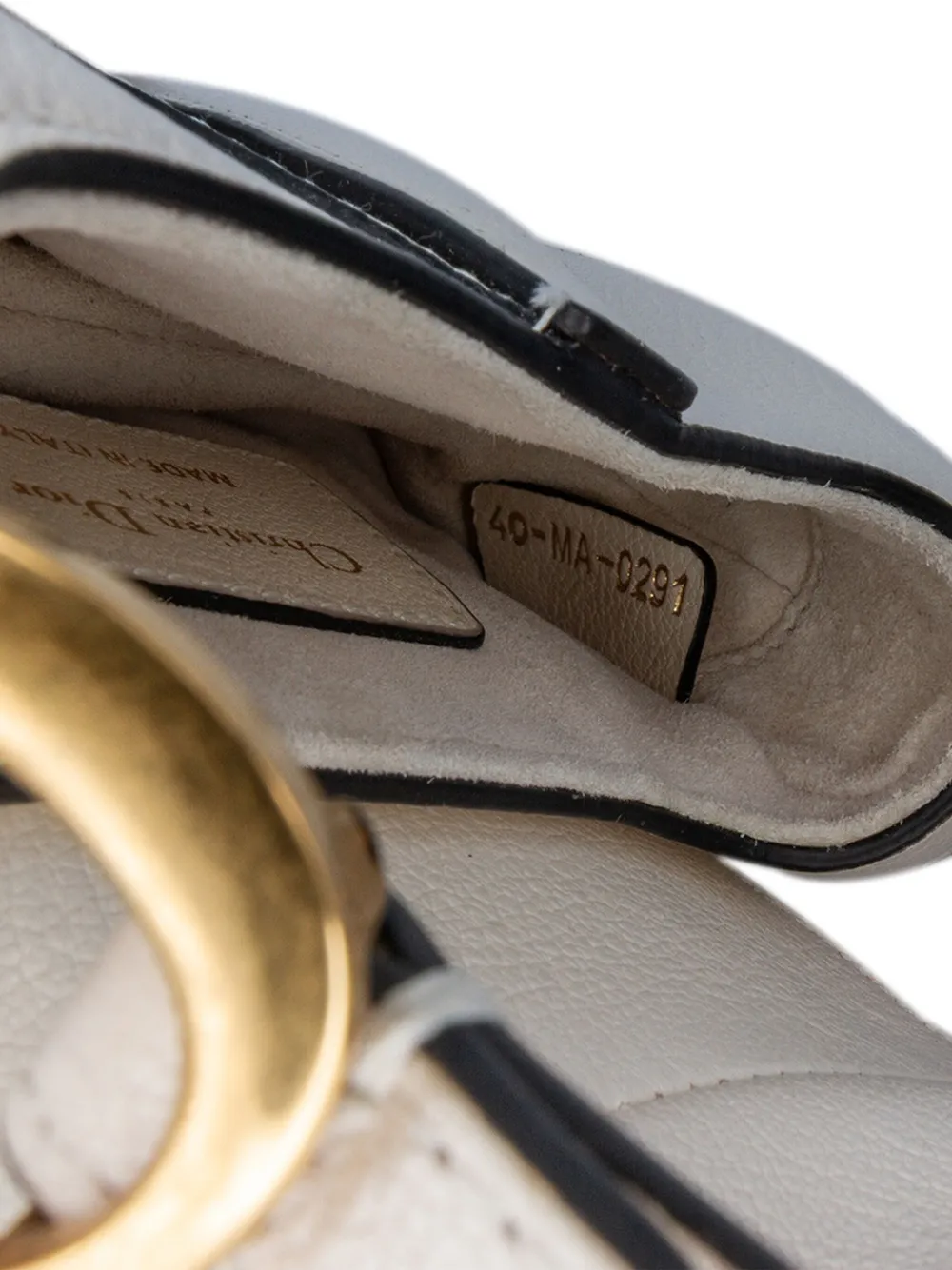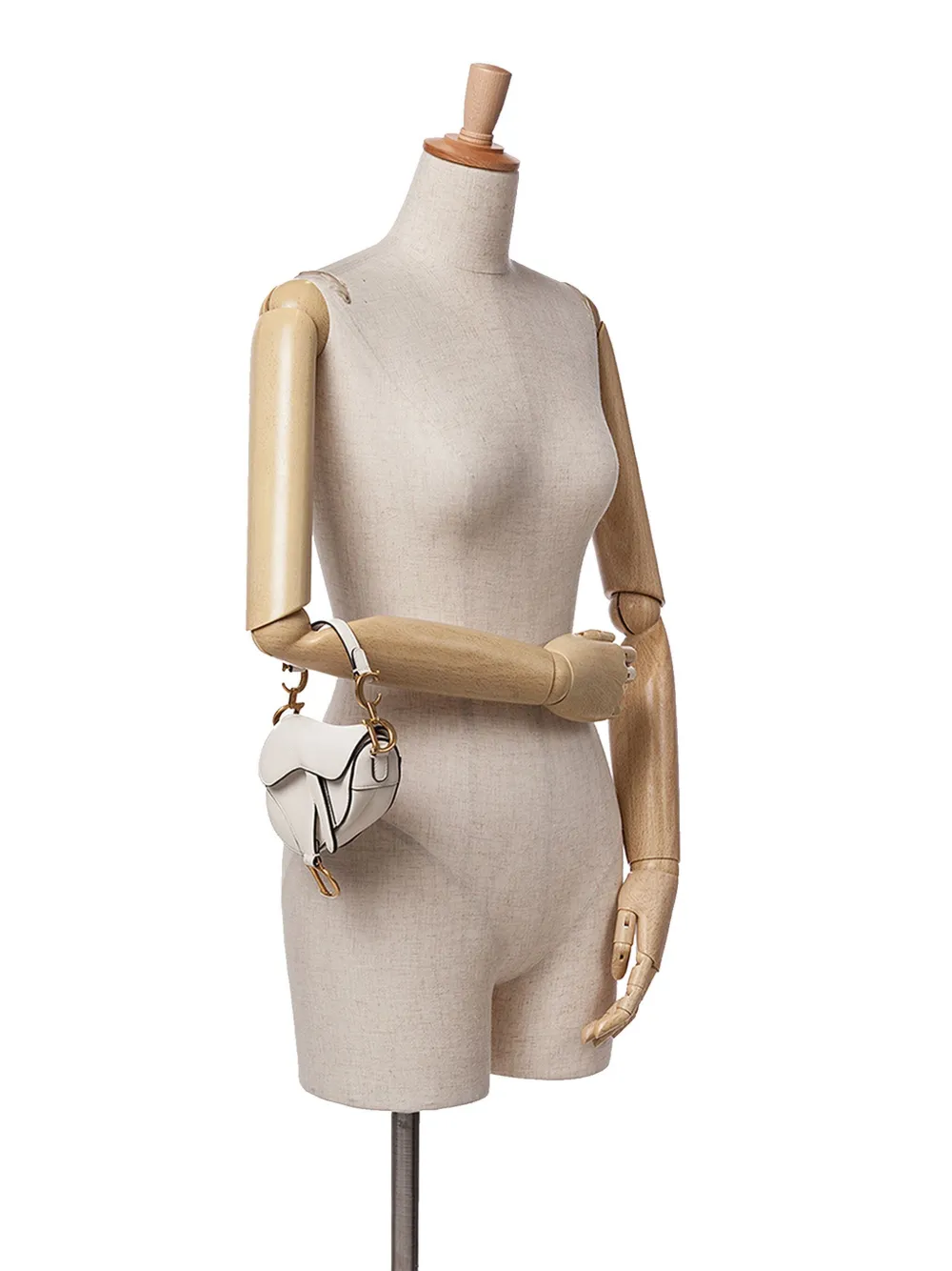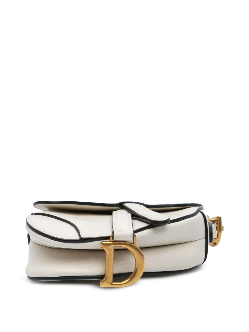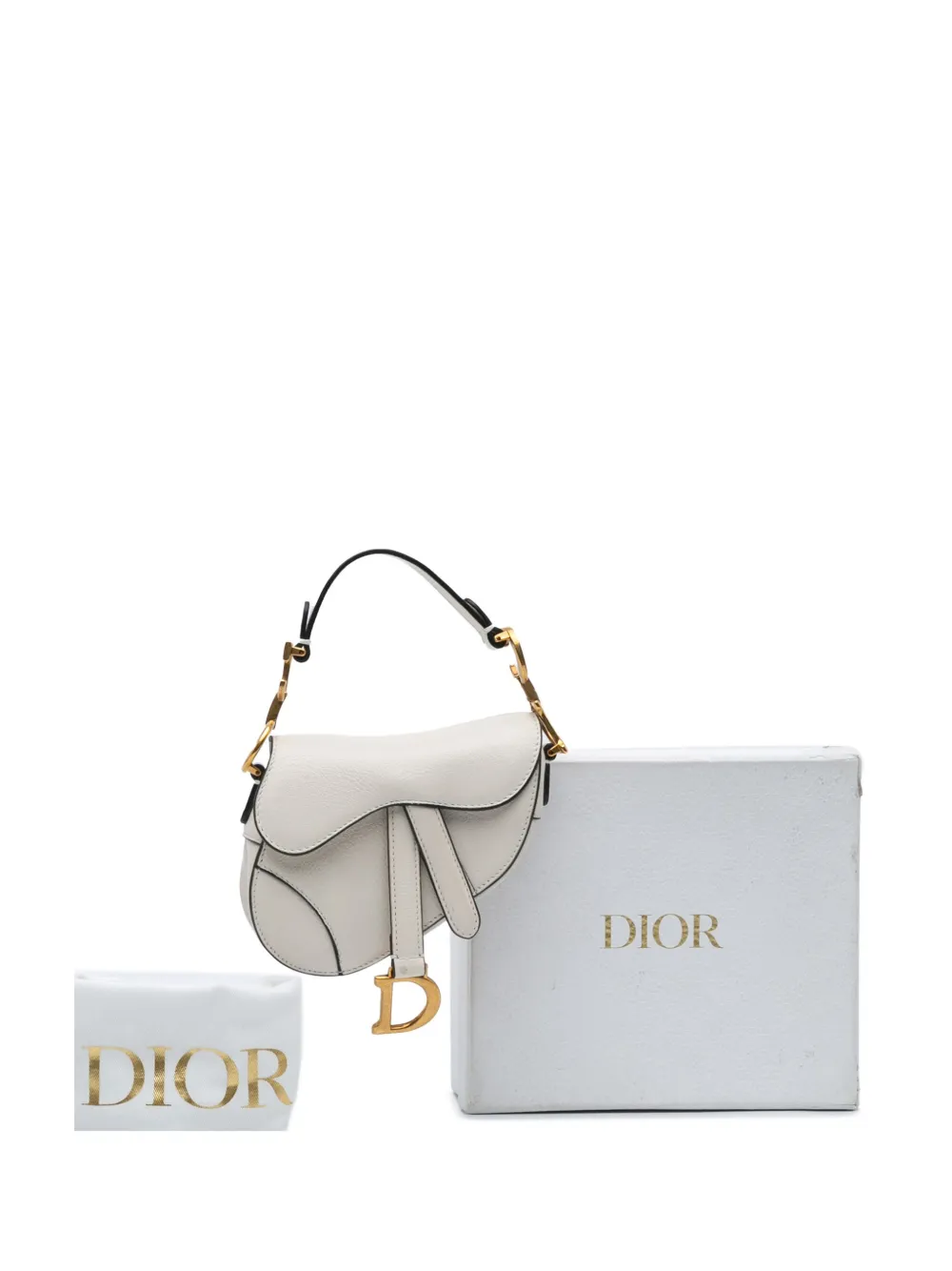 The Saddle bag features a leather body, a flat leather handle, and a front flap with a magnetic closure. White. Serial Number: 40-MA-0291. Inclusions: dust bag, box. Condition: GOOD. This previously owned and used item is in good condition with minimal signs of use. This may include fading of material or plating and scratches. Please refer to the photos on this product page for a detailed view of the item, including any damages declared.