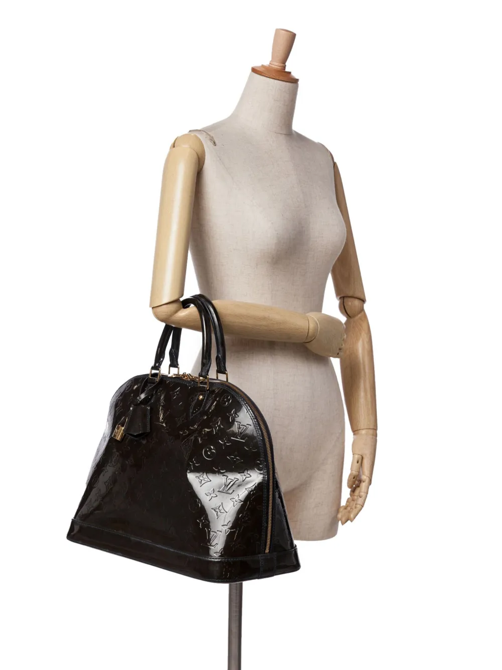 The Alma GM features a monogram vernis leather body, rolled leather handles, a clochette, a top zip closure, and interior slip pockets. Black. Serial Number: MI0121. Inclusions: charm, padlock, key. Condition: GOOD. This previously owned and used item is in good condition with minimal signs of use. This may include fading of material or plating and scratches. Declared Damages: Exterior Side Feature(s) Moderate Discoloration. Front Feature(s) Moderate Discoloration. Handle/Strap Feature(s) Moderate Discoloration. Please refer to the photos on this product page for a detailed view of the item, including any damages declared.