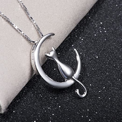 S.Leaf Cat Moon Necklace Sterling Silver Necklaces for Women Cat Necklace