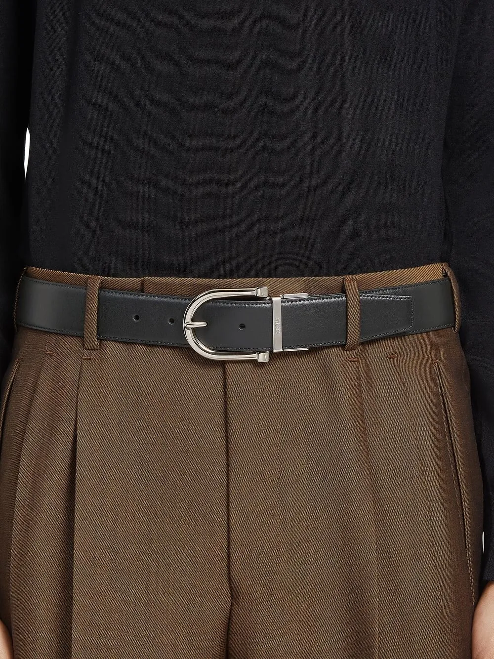 black calfskin leather strap reversible engraved logo silver-tone buckle fastening punched holes wraparound style adjustable fit